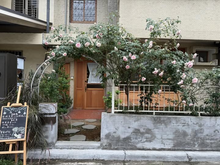 百歲堂外面院子種有多重花瓣的玫瑰,花香濃郁。外牆有古風味的淡黃細小磁磚,正面看來有英式古風味,透露出安靜典雅的百年風華。