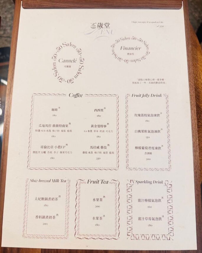 百歲堂有賣咖啡、奶茶等飲料,甜點有可麗露及費南雪等法式點心。